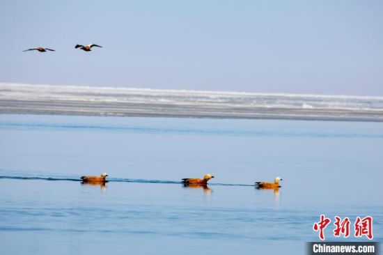 3月24日,赤麻鸭、斑头雁等候鸟在解冻水域栖息觅食。赵海梅 摄
