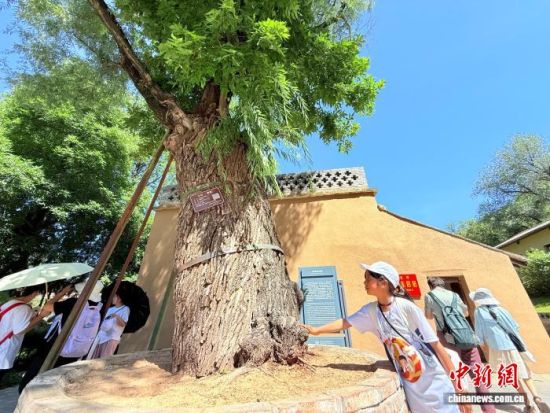 图为王家坪纪念馆的旧址院落里,学生轻抚旱柳。刘洋 摄