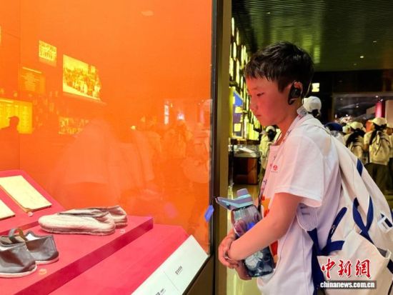 图为在延安革命纪念馆的展柜前,研学学生正凝视着一双布满磨损痕迹的布鞋。刘洋 摄
