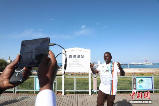 图为非洲青年在青海湖畔拍摄视频。马铭言 摄