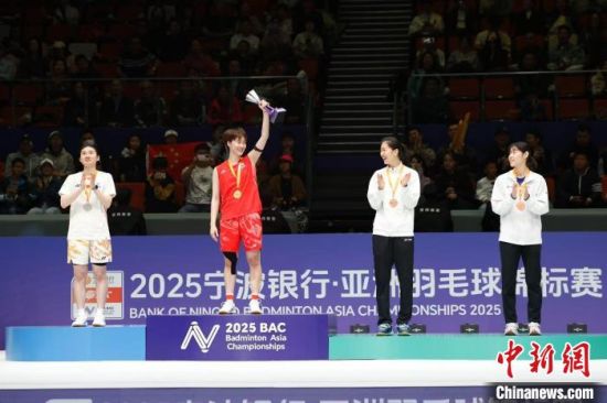 4月13日,2025亚洲羽毛球锦标赛各单项决赛在浙江宁波进行,中国选手陈雨菲2比1战胜队友韩悦,夺得女单冠军。图为陈雨菲(左二)在颁奖现场。 肖健 摄