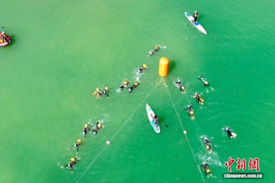 航拍图为参赛选手在黄河竞游。薛蒂 摄