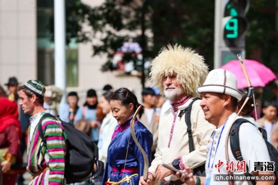 9月5日,参加第八届“五彩神箭”国际民族传统射箭邀请赛的中外选手代表与青海省黄南藏族自治州尖扎县民众共同参与巡街表演。选手与当地民众身着盛装,手持传统弓箭,一同沿街行进,以体育赛事搭建交流平台,促进文化交融。